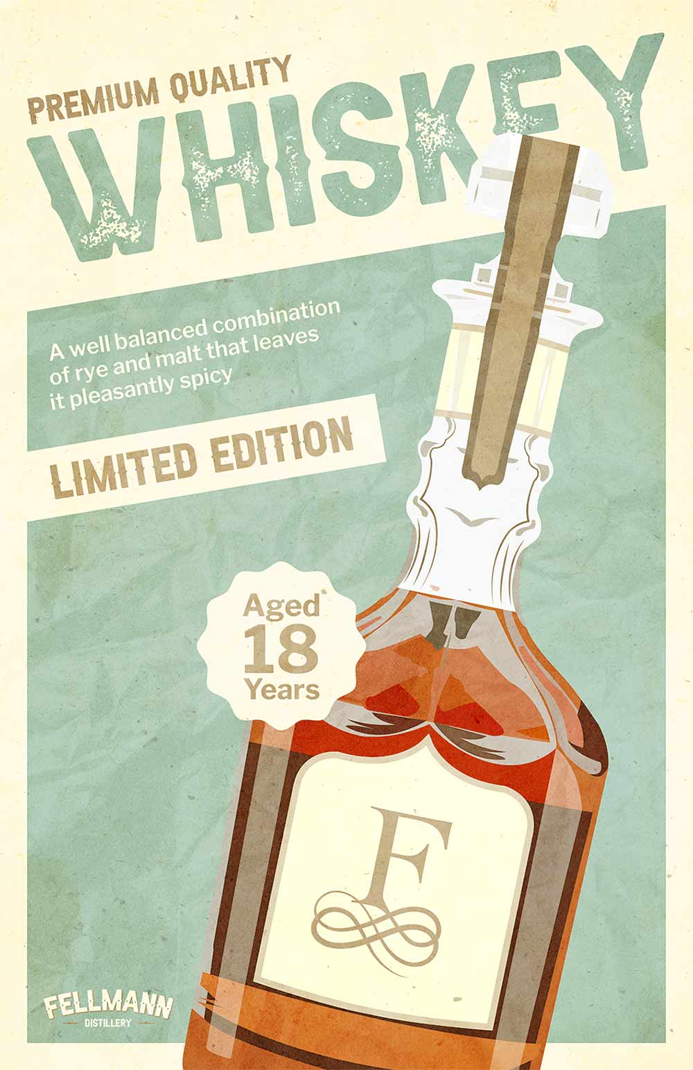 My neighbor is a huge collector of rare whiskeys and has a “whiskey room” in his house. I wanted to design a whiskey poster to be hung inside. I created a distillery logo in his name, Fellmann, and used colors that match the room.